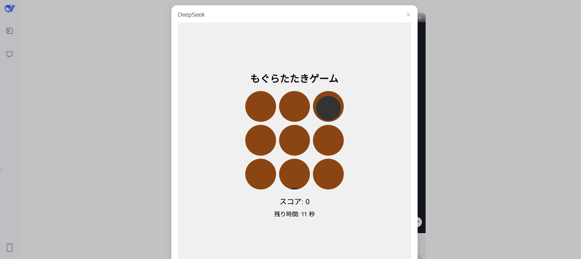 せっかくなので、DeepSeekに何か作らせてみましょう。今回は、ブラウザで動くもぐらたたきのゲームを作ってみました。最後にゲームページへのリンクを用意しましたので、よかったら試してみてください。